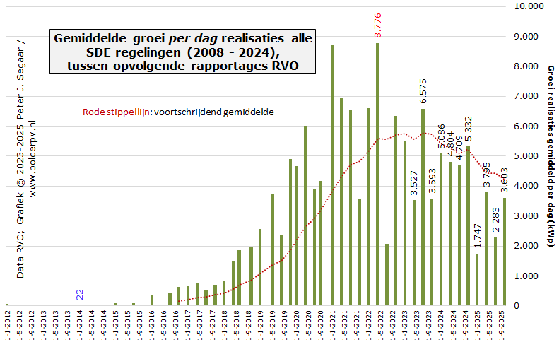 Deze grafiek toont de gemiddelde groei van de nieuwe capaciteit per dag tussen twee RVO updates, daarbij rekening houdend met het aantal dagen tussen de peildata van de gepubliceerde rapportages. Tm. 2015 gebeurde er relatief weinig, met de laagste toename eind 2013 (22 kWp gemiddeld per dag nieuw volume gerealiseerd in die periode). Vanaf 2016 zijn de administratieve bijschrijvingen in de SDE gedreven projectenmarkt merkbaar gegroeid, vielen ze in Corona jaar 2020 kort terug, en lieten daarna nog sterkere wisselingen van het tempo te zien. Om te culmineren in het eerste kwartaal van 2022, met een record niveau van gemiddeld 8.776 kWp per dag toegevoegd in die periode. Na sterke wisselingen in het tempo werd 2024, met het laagste niveau in lange tijd afgesloten, 1.747 kWp/dag. In QI 2025 nam dat weer flink toe (3.795 kWp/dag), om het daar op volgende kwartaal weer net zo hard in te zakken, naar een niveau van 2.283 kWp/dag. Het derde kwartaal ging weer in de versnelling, en kwam op een volume van 3.603 kWp/dag uit. Dat was wel slechts 68% van de toename in QIII 2024 (5.332 kWp/dag).