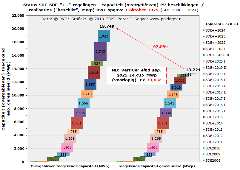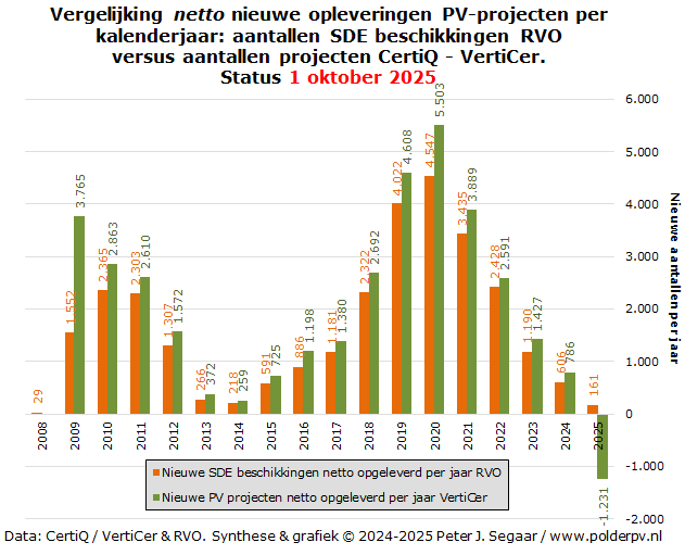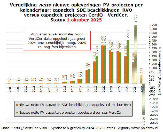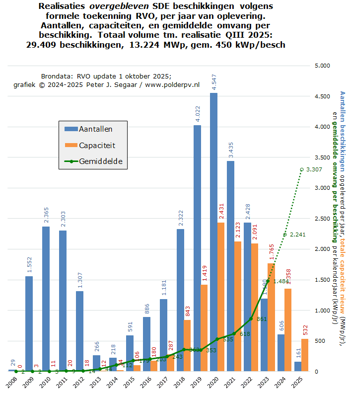 De nieuwe realisaties leidden, in cumulatie, begin oktober 2025, tot een volume van 13.224 MWp aan (SDE) beschikt gerealiseerd PV vermogen, verdeeld over inmiddels 29.409 gerealiseerde (overgebleven) aanvragen. Door verliezen / uitschrijvingen van veelal oudere gerealiseerde projecten, is dat aantal weer onder de dertigduizend exemplaren gekomen. De netto realisatie van bijna 331 MWp beschikt vermogen in het derde kwartaal van 2025, is 59% hoger dan de bijna 208 MWp toename in QII 2025. Gerekend naar het door RVO gemelde jaar van oplevering van de afzonderlijke beschikkingen, zou er een voorlopige toename van 1.765 MWp aan beschikte capaciteit zijn geweest in 2023, momenteel bijna 16% minder dan de huidig vastgestelde aanwas in 2022 (2.091 MWp). De jaargroei in 2024, momenteel 1.358 MWp, 23% minder dan de jaargroei in 2023, is weliswaar nog steeds zeer voorlopig maar de verwachting is, dat deze cijfers niet "zeer substantieel" zullen gaan wijzigen. Wat de al langer door Polder PV sterk betwijfelde data van VertiCer, met véél hogere capaciteits-volumes voor de jaren 2023 en 2024, in een extra kritisch daglicht stellen.