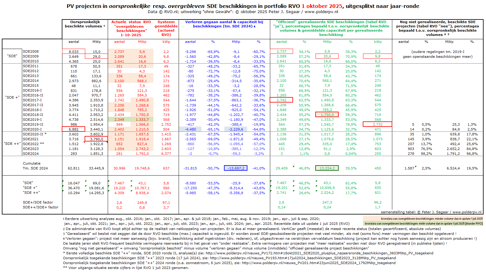 In deze meest recente update is bij de opgeleverde capaciteit, door RVO een "officieel" SDE beschikt zonnestroom volume opgegeven van 13.224 MWp (voor peildatum 1 juli 2025 was dat 12.893 MWp), verdeeld over 29.409 overgebleven project beschikkingen. In het overzicht van 1 juli 2025 lag dat laatste nog op een volume van 30.318 gerealiseerde toekenningen. Wat betekent, dat er netto meer registraties zijn verdwenen bij RVO, dan er zijn ingeschreven, in het laatste kwartaal (vergelijkbaar met de netto uitstroom in het omvangrijke VertiCer dossier). In de update van januari 2024 werd de piketpaal van netto dertigduizend gerealiseerde beschikkingen gepasseerd, maar door de toenemende uitschrijvingen bij RVO, is het overgebleven niveau dus weer onder die piketpaal gezakt. De capaciteit blijft nog steeds doorgroeien, wat betekent dat er een concentratie is van steeds grotere projecten in de RVO bestanden, en dat met name kleinere gerealiseerde projecten het RVO systeem "verlaten". Wat nog niets zegt over hun status, ze kunnen immers nog zeer lang gewoon doordraaien zonder SDE subsidie.