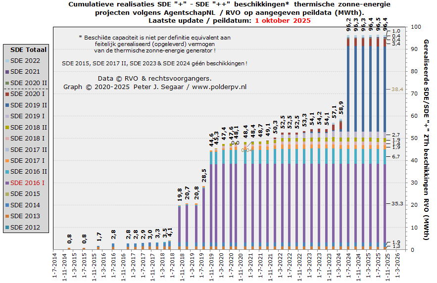 In de update van 1 juli 2025 is 1 SDE 2021 beschikking voor een thermisch project in het Overijsselse Rijssen verzilverd, met een capaciteit van 173 kWth, is het oudste gerealiseerde project met beschikking voor SDE 2012 (102 kWth), te 's-Gravendeel, uit de records van RVO verdwenen (...), en is de laatste overgebleven SDE 2019 I beschikking die nog niet was ingevuld, met een omvang van 168 kWth, ook verwijderd.